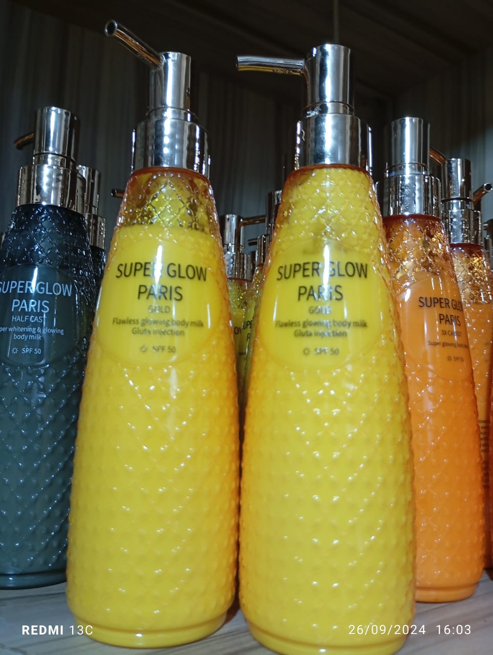 Super Glow Paris Gold Lotion is a luxurious body lotion designed to hydrate, nourish, and brighten your skin. Infused with gold extract and natural moisturizers, it helps to reduce dryness, even out skin tone, and improve texture. This lightweight lotion absorbs quickly, delivering long-lasting hydration and a healthy glow. Suitable for all skin types, Super Glow Paris Gold Lotion is perfect for daily use, ensuring your skin stays soft, smooth, and radiant all day long. Achieve a flawless finish with this premium skincare essential.